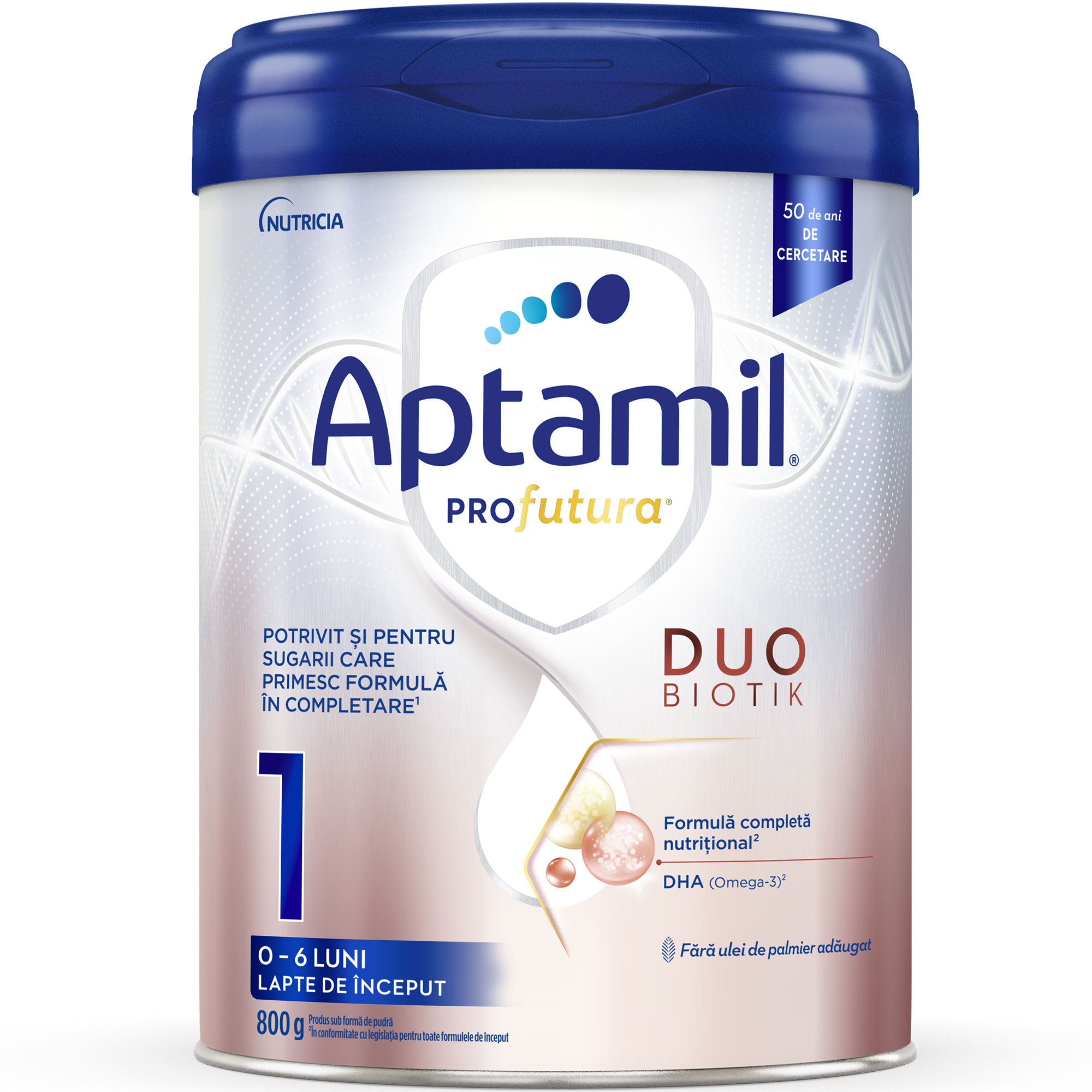 Formulă completă nutrițional: Aptamil ProFutura 1 este potrivită pentru nutriția bebelușilor de la naștere și până la 6 luni și se folosește la recomandarea medicului;