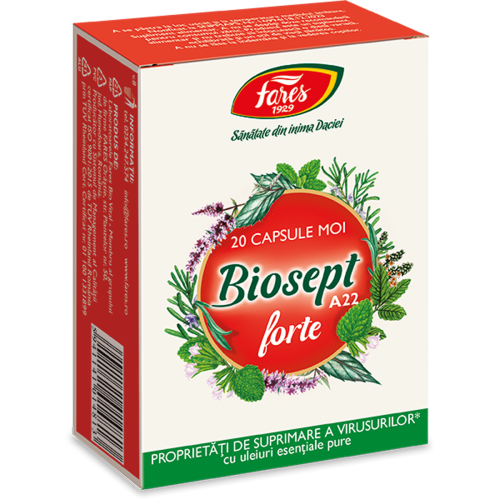 Biosept Forte, 20 capsule, producator Fares, Romania, este un supliment alimentar cu proprietati antivirale, cu o formula concentrata pe baza de uleiuri esentiale pure.