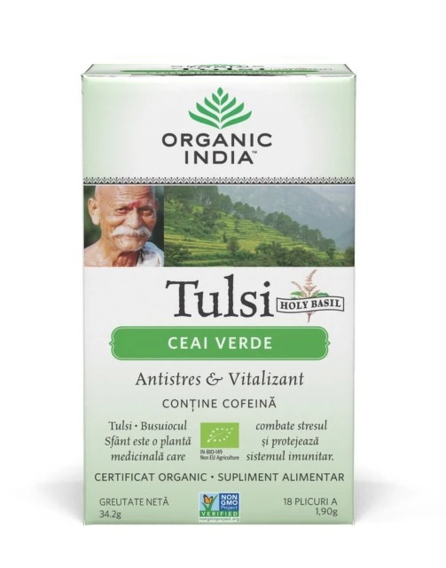 Antistres Natural & Vitalizant Ceai din Plante 100% Certificate Organic in UE, SUA si India Contine cofeina 34,2g, 18 plicuri pentru infuzie Beneficii Antistres si energizant natural Adaptogen Poate conferi un efect relaxant si stare de bine imediat dupa consum Sustine organismul in a se proteja de efectele negative ale stresului Poate avea rol benefic in starile de anxietate si agitatie psihica Poate contribui la imbuntatirea starii psihice Sprijina digestia Sustine sanatatea metabolismului Sustine sanatatea sistemului imunitar Abunda in antioxidanti Benefic in raceala si gripa Fara microplastic Caracteristici ORGANIC INDIA Ceai Verde Tulsi (Busuioc Sfant), Antistres Natural & Vitalizant este un produs 100% Certificat Organic si nu contine organisme modificate genetic. Nu contine si nu sunt folosite in niciun stagiu al productiei pesticide sintentice, erbicide, ingrasaminte sau alte tratamente chimice. ORGANIC INDIA Ceai Verde Tulsi (Busuioc Sfant), Antistres Natural & Vitalizant reprezinta un amestec armonios de Tulsi si cel mai fin Ceai Verde, cu note simple de aroma de lamaie ce provine din Tulsi. Aceasta combinatie extraordinara de arome confera un impuls de energie naturala cu o doza mare de antioxidanti! Ingrediente Informatii nutritionale: Portie: 1 plic infuzie (aprox. 240ml) Cantitate per plic: Amestec organic din: Frunze de Ceai Verde Organic (Camellia sinensis) 35.00% Frunze de Tulsi Krishna Organic (Ocimum sanctum) 21.67% Frunze de Tulsi Rama Organic (Ocimum sanctum) 21.67% Frunze de Tulsi Vana Organic (Ocimum gratissimum) 21.66% In India, Tulsi (cunoscut si sub denumirea de Busuioc Sfant) este considerat „Regina Plantelor Medicinale” si este venerat ca planta sacra, cu putere vindecatoare. Tulsi este cultivat in mod traditional intr-un vas de lut in orice casa sau gradina, iar beneficiile sale pentru sanatate sunt in mod repetat amintite in manuscrise Indiene vechi de pana la 5.000 de ani. In hinduism, Tulsi este vazut ca o zeita in forma unei plante care a fost inzestrata cu extraordinare puteri spirituale si vindecatoare. Potrivit legendelor, nicio cantitate de aur nu putea cantari mai greu decat puterea Krishnei, insa o singura frunza de Tulsi pusa cu dragoste si devotament reusea sa incline balanta. Cercetarile moderne au clasificat Tulsi ca planta adaptogena sau planta ce sustine sistemul imunitar si indeparteaza efectele negative ale stresului si anxietatii, creste vitalitatea si rezistenta organismului, este energizant, bogat in antioxidanti, sprijina digestia, incetineste procesele de imbatranire a organismului, regleaza metabolismul, sustine procesele naturale de detoxifiere, mentine sanatatea tractului respirator, are proprietati antiinflamatorii. Tulsi conține acid ursolic, cu rol în inhibarea enzimelor producătoare de inflamații COX-2, eficient în stimularea detoxifierii organismului și reducerea inflamațiilor. Ceaiul verde reprezinta una dintre cele mai sanatoase alternative pentru energizarea si vitalizarea organismului. Bogat in antioxidanti – polifenoli, flavonoide, catechine – ceaiul verde are efect antistres, blocheaza efectele radicalilor liberi si previne daunele la nivel celular si, implicit, imbatranirea prematura a organismului. Ceaiul verde imbunatateste functiile cognitive, stimuleaza arderea grasimilor, regleaza nivelul glicemiei din organism si protejeaza sanatatea sistemului cardiovascular. Mod de administrare Cate 1 plic de 3 ori pe zi. Sigur pentru folosire indelungata. Recomandare pentru cele mai bune rezultate: Turnati apa fierbinte peste plicul pentru infuzie, intr-o ceasca mare. Acoperiti pentru 3-5 minute. Veti descoperi aroma deosebita cu fiecare inghititura. Folositi 2 plicuri daca pregatiti pentru consum rece, cu gheata. Nu depasiti doza recomandata pentru consumul zilnic. Fara gluten – Kosher Daca sunteti insarcinata sau alaptati, consultati medicul inainte de consum. Pastrati la loc uscat si racoros, ferit de razele soarelui. Consumati in decurs de 2 luni de la prima utilizare. Nu lasati produsul la indemana copiilor mici. Certificari ORGANIC INDIA Ceai Verde Tulsi (Busuioc Sfant), Antistres Natural & Vitalizant este: Certificat Organic de Uniunea de Control – 801983 Produs si procesat respectand standardele NPOP ale Indiei si USDA-NOP Certificat Organic de USDA (United States Department of Agriculture) Certificat Organic conform standardelor UE Produs NON GMO (nemodificat genetic) Notificare: SNPMAPS, 10560  / 2016 Toate produsele ORGANIC INDIA contin Plante 100% Certificate Organic, ceea ce inseamna ca nu se folosesc pesticide sau fertilizatori sintetici in niciun stagiu al productiei. Toate plantele sunt recoltate exclusiv de la agricultorii nostri, iar metodele unice de cultivare, recoltare si procesare le protejeaza integritatea nutritionala. Produsele ORGANIC INDIA promoveaza sanatatea, fericirea si „Adevarata Stare de Bine” si sunt realizate cu grija si iubire. Fiecare dintre produsele noastre intruchipeaza dragostea, respectul si legatura dintre Natura Mama, fermieri, compania noastra si dumneavoastra. Muncim alaturi de mici familii in cultivarea a mii de hectare de teren agricol in mod ecologic si sustenabil pentru a oferi o viata demna agricultorilor indieni si pentru a va oferi dumneavoastra sanatate si fericire. Alegand ORGANIC INDIA participati si dumneavoastra activ la misiunea noastra de a crea un mediu inconjurator sustenabil! Resurse stiintifice relevante despre plantele din componenta produsului Anti-stress activity of Ocimum sanctum Linn. Mechanism of anti-stress activity of Ocimum sanctum Linn, eugenol and Tinospora malabarica in experimental animals. Noise-Stress-Induced Brain Neurotransmitter Changes and the Effect of Ocimum sanctum (Linn) Treatment in Albino Rats Effect of Ocimum sanctum Linn. on cardiac changes in rats subjected to chronic restraint stress Studies on protective mechanisms of four components of green tea polyphenols against lipid peroxidation in synaptosomes Cross section
