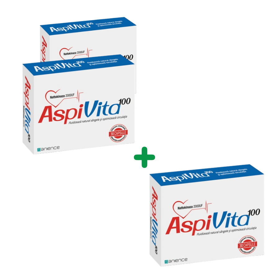 Cumpara pachetul Aspivita 100*30cps si primesti a-3 a cutie gratuit. Campania este valabila in perioada 01-31.03.2026, in limita stocului disponibil.
