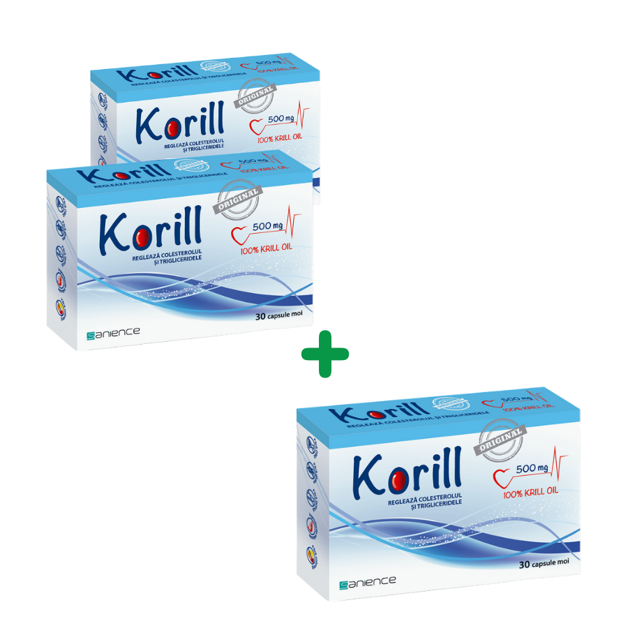 Cumpara pachetul Korill 500mg*30cps.moi si primesti a-3 a cutie gratuit. Campania este valabila in perioada 01-31.03.2026, in limita stocului disponibil.