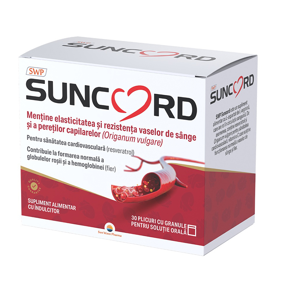 SWP Suncord este un supliment alimentar cu L-aspartat de L-arginina, care are rol in circulatia sanguina. De asemenea, contine resveratrol si Origanum vulgare pentru sanatatea cardiovasculara, vitamina C care sustine functionarea normala a vaselor de sange si fier.
