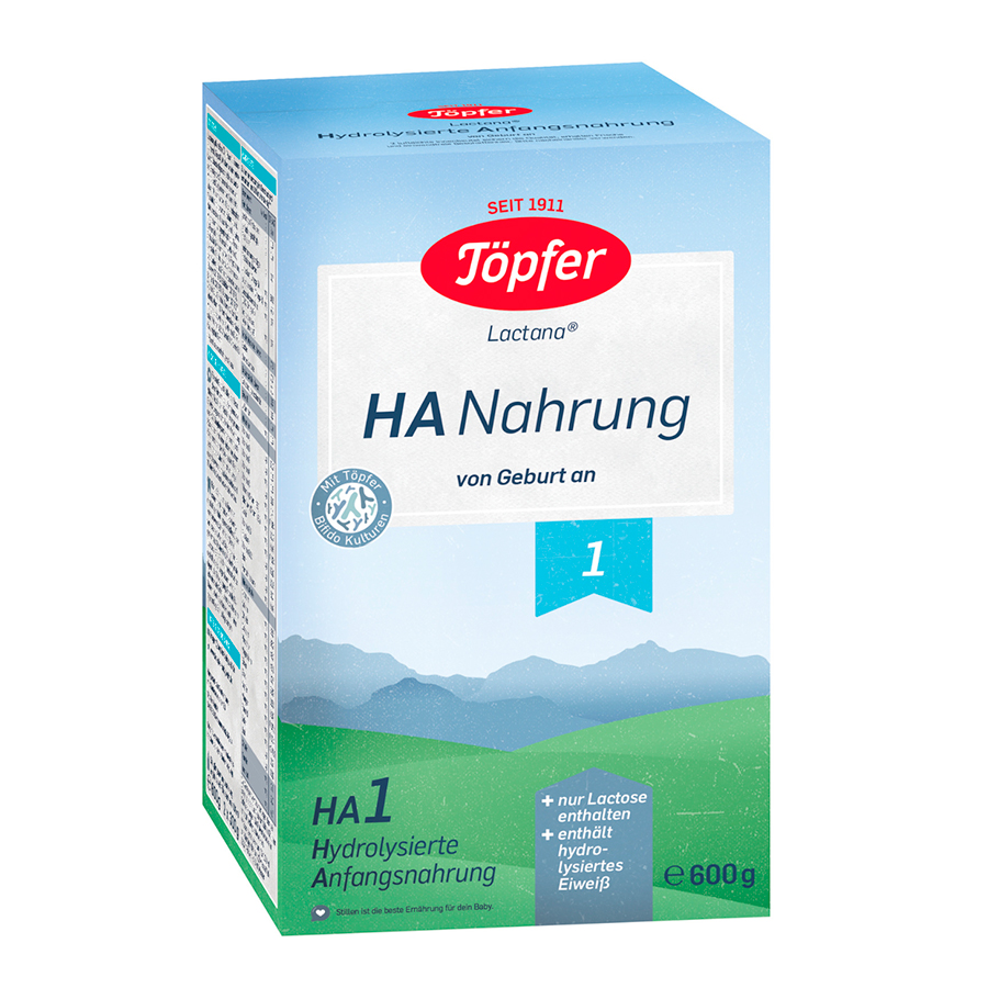 Formula de lapte praf Töpfer HA 1, 600 g, producator Töpfer, Germania, indeplineste cele mai inalte standarde de calitate si este adaptat la nevoile nutritionale speciale ale bebelusilor. Contine numai zaharuri din lapte (lactoza). Poate fi administrat bebelusilor atat de des si atat de mult cat doresc sa bea.